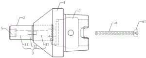 具体的,刀杆本体2固定于刀柄本体1的一端。刀杆本体2中贯穿一通孔3,该通孔3与刀杆本体2同轴设置。该通孔3,按照从靠近刀柄本体1的一端向刀杆本体2的一端延伸的方向,依次包括连通的第一孔段31、螺纹段32和第二孔段33。在该通孔3靠近刀柄本体1的一端设有一容纳腔4,远离刀柄本体1的一端设有一柱形凹槽5。