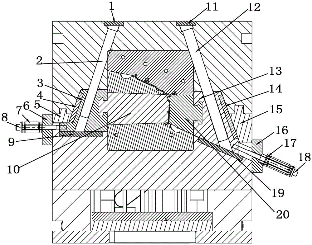 11-inclined guide post pressure plates II, 12-inclined guide posts II, 13-sliding blocks II, 14-sliding block II back wear-resisting plates, 15-locking blocks II, 16-sliding block tail bases II, 17-sliding block springs II, 18-screw rods II, 19-wear-resisting plates II, 20-sliding block heads II;