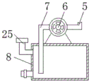 In the figure: 1. a stirring box; 2. a waste bin; 3. a control panel; 4. a feed inlet; 5. an exhaust pipe; 6. an exhaust fan; 7. an exhaust duct; 8. a purification box; 9. a chassis; 10. a support frame; 11. a discharge port; 12. a base plate; 13. a material taking box; 14. a valve; 15. a transmission rod; 16. a rotating electric machine; 17. an oscillating motor; 18. screening a screen; 19. a dust hood; 20. a waste discharge pipe; 21. a fixed block; 22. a bearing; 23. a stirring rod; 24. a stirring shaft; 25. a water storage opening.