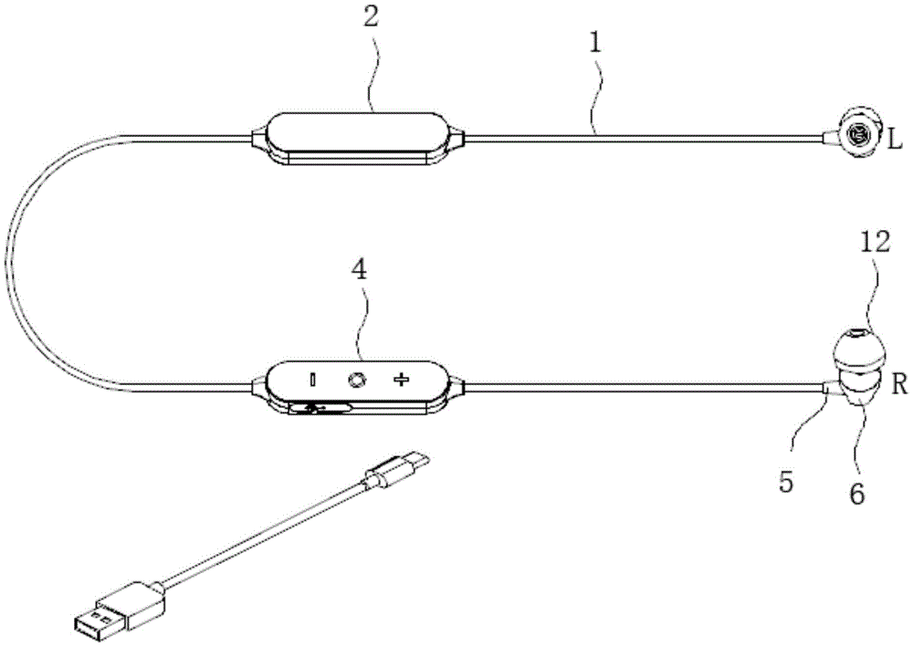 An adapter plate 13 is installed on one side inside the battery box 2, one side of the adapter plate 13 is electrically connected with one side of the battery 3, the other side of the adapter plate 13 is electrically connected with one side of the earphone cord 1, and the adapter plate 13 is used for electrically connecting the battery 3 with one side of the earphone cord 1.