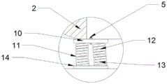 1. The utility model provides a noise control equipment for environmental protection engineering which characterized in that: the damping and air-out device comprises a sound insulation device (1), a sound absorption plate (8) is laid in the sound insulation device (1), a generator (2) is installed in the sound insulation device (1), a damping column (3) is installed at the bottom of the generator (2), a telescopic rod (12) is fixedly installed at the bottom of an upper clamping plate (10) of the damping column (3), the lower end of the telescopic rod (12) is inserted into a telescopic rod sleeve (13), the bottom end of the telescopic rod sleeve (13) is installed on a base (14), a spring (11) is sleeved on the outer side of the telescopic rod sleeve (13), the upper end and the lower end of the spring (11) are respectively fixed on the upper clamping plate (10) and the base (14), a damping air-out channel (4) is installed on the left wall of the sound insulation device (1), a damping pipe (6) is horizontally installed between the left wall and the right wall of the damping air-, the left wall and the right wall of the silencing air outlet channel (4) are respectively provided with an inclined silencing plate (7), and the right wall of the silencing air outlet channel (4) is provided with an exhaust fan (9).