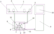 In the figure: 1. a water spraying pool; 2. a sedimentation tank; 3. a submersible pump; 4. a connecting pipe; 5. a water inlet pipe; 6. a bag filter; 7. a second water outlet; 8. a water outlet pipe; 9. a sewage draining well; 10. a well house; 11. a blowdown valve; 12. a water return valve; 13. a water inlet; 14. a water inlet valve.