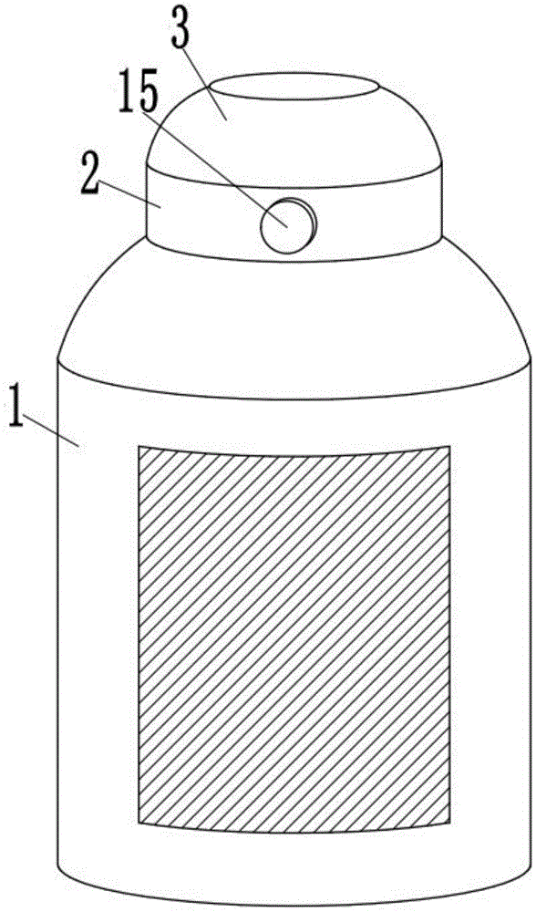 Furthermore, a slot 9 is formed in one side of the outer wall of the top of the fixing cap 2, an inserting block 10 inserted into the slot 9 is welded on one side of the outer wall of the bottom of the bottle cap 3, a clamping groove 11 is formed in the outer wall of one side of the inserting block 10, and the bottle cap 3 can be fixed on the fixing cap 2 when the clamping block 14 is clamped in the clamping groove 11.