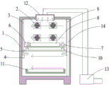Still further, in order to guarantee the dust removal effect to the dust of the internal 1 of cabinet, box-type switch board is still including setting up the air curtain machine 14 in the internal 1 of cabinet, and wherein air curtain machine 14 is located a lateral wall of the internal 1 of cabinet, and air curtain machine 14 provides the air curtain and forms the dust removal space of one with the internal wall of cabinet 1 for drifting away the dust limits in this dust removal space, and the convulsions of cooperation exhaust column 12 improve the dust removal effect greatly, further prevent that the dust from drifting to the circuit board of the internal 1 of cabinet, effectively improve the utility model discloses a box-type switch board reliability.