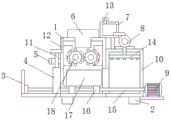 In the figure: 1. a box body; 2. supporting legs; 3. a carrier plate; 4. a partition plate; 5. a limiting block; 6. a feeding port; 7. a water tank; 8. a pump machine; 9. a motor; 10. a dust falling box; 11. a pull rod; 12. a chute; 13. a water injection port; 14. a spray head; 15. a screw; 16. a thread block; 17. a storage box; 18. a crushing roller.