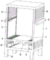 In the figure: 1. a box body; 2. a support plate; 3. the electric heating wire connecting pipe; 4. an electric heating wire; 5. a fan cylinder; 6. a conduit; 7. a fan blade; 8. air holes; 9. a moisture removal air pipe; 10. a moisture removal port; 11. a fan; 12. an exhaust barrel; 13. an exhaust through groove; 14. supporting legs; 15. a desiccant storage case; 16. a rain-proof sloping plate; 17. a heat exhaust port; 18. a heat removal through groove.
