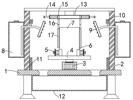 In the figure: the device comprises a supporting table 1, a supporting plate 2, a driving motor 3, a rotating table 4, a first adjusting bolt 5, an arc-shaped clamping plate 6, a cylindrical part 7, a water tank 8, a spraying plate 9, a water pump 10, a water storage vessel 11, a recycling bin 12, a hollow cylinder 13, a second adjusting bolt 14, a sliding block 15, an electric telescopic rod 16 and a wiping strip 17.