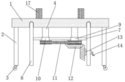 图中:1、顶板;2、支腿;3、滑轮;4、套筒;5、卡槽;6、丝杆;7、固定板;8、支撑杆;9、第一传动轮;10、第二传动轮;11、皮带;12、第一锥形齿轮;13、第二锥形齿轮;14、摇杆;15、安装槽;16、弹簧;17、夹持块。