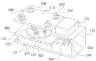 图中:100、支撑装置;110、支板;120、支柱;130、支台;140、保护壳;200、驱动装置;210、电机;220、转轴;230、转轮;240、轴承;250、转台;260、皮带;300、转向装置;310、支杆;320、万向球;330、支块;400、调整装置;410、凹耳;420、转杆;430、调节杆;440、转柱;450、调节板;460、连耳;470、转销;500、固定装置;510、安装板;520、螺钉;530、第一螺母;540、夹板;550、第二螺母。