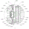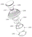 Referring to fig. 2 to 4 and fig. 9, in this embodiment, the essential oil aromatherapy device 13 includes an atomizing flow guide plate 1301, an essential oil tank main body 1302, an atomizing sheet 1303, an atomizing sheet pressing plate 1304, a metal ring 1305, an aromatherapy air outlet cover 1306, a sealing plug 1307, a strong magnet 1308 and a decorative cover 1309, where the essential oil tank main body 1302 is a cylindrical shell, one end of the essential oil tank main body 1302 is provided with a through hole, the other end of the essential oil tank main body is provided with an annular through hole, the atomizing sheet 1303 is installed in the annular through hole of the essential oil tank main body 1302 and fixed by a silica gel piece on the atomizing sheet 1303, the atomizing flow guide plate 1301 is installed at one end of the annular through hole of the essential oil tank main body 1302, the atomizing flow guide plate 1301 and the essential oil tank main body 1302 are ultrasonically welded, the metal ring 1305 is installed at the through hole end of the essential oil tank main body 1302, the aromatherapy air outlet cover 1306 is installed at the front ends of the essential oil tank main body 1302 and the metal ring 1305, the air outlet cover 1306 is provided with an aromatherapy air outlet channel, the essential oil tank main body 1306 is ultrasonically welded with the essential oil tank 1302, interior concave part is equipped with in the middle of champignon air-out cover 1306, and interior concave part is equipped with a through-hole, and sealed end cap 1307 is installed at champignon air-out cover 1306 interior concave part through-hole department, and sealed end cap 1307 adopts silica gel material, and strong magnet 1308 installation tight fit is inside dress trim cover 1309, and dress trim cover 1309 is installed at champignon air-out cover 1306 interior concave part.