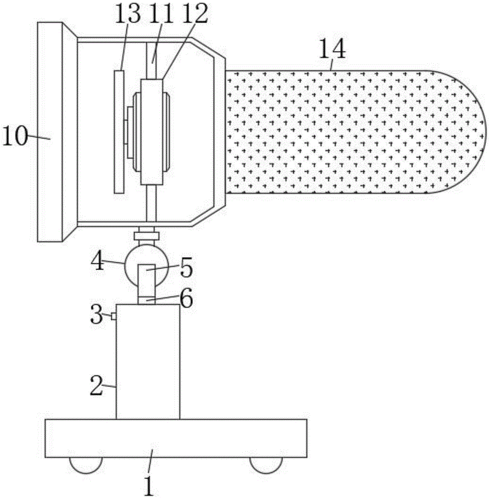 本实用新型公开了一种建筑施工用除尘装置,涉及施工除尘装置领域,包括支撑板,所述支撑板的顶端连接有支撑柱,且支撑柱的一侧设置有横向拨盘,所述支撑柱的顶端连接有连接柱,且连接柱的顶端连接有横向换向器,所述横向换向器的一侧连接有换向球,且换向球的一侧设置有纵向换向器,所述纵向换向器的一侧连接有纵向拨盘,所述换向球的顶端连接有机箱,所述机箱的内部安装有电机,且电机的输出端连接有扇叶,所述电机的两端连接有连接条,所述机箱的一侧连接有防尘布袋。本实用新型通过设置横向拨盘、横向换向器、纵向拨盘、纵向换向器等实现该装置的角度调节功能,从而使该装置具备多角度调整状态,由此提高该装置的实用性和操作性。