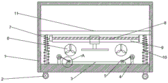 请参阅图1~2,本实用新型实施例中,一种汽车内饰板打磨工装,包括有打磨仓1,所述打磨仓1内底部安装有放置台3,所述放置台3两侧安装有夹持装置,所述夹持装置包括有支撑杆4,所述支撑杆4顶端固定安装有第一电机,所述第一电机输出端固定安装有圆盘,所述圆盘与第一连接杆偏心铰接,所述第一连接杆的另一端连接有夹持块5,所述夹持块5与放置台3滑动连接,所述夹持块5底部开设有供夹持块5滑动的第一滑轨,通过夹持装置将所需打磨物件夹紧固定,所述打磨仓1的后侧壁上安装有排风扇6,所述排风扇6将打磨灰尘吸出由滤网进行过滤,从而起到防尘作用,有效的减小粉尘污染,所述打磨仓1中滑动安装有横板11,所述横板11底端安装有固定箱9,所述固定箱9外侧壁上安装有第二电机7,所述第二电机7输出端贯穿固定箱9一侧连接有第一螺纹杆8,所述第一螺纹杆8远离第二电机7的一端通过第一轴承转动连接在固定箱9的一侧,所述第一螺纹杆8套接有螺纹块,所述螺纹块与第一螺纹杆8通过螺纹连接,所述螺纹快底部固定连接有打磨机,所述横板11底部两侧安装有伸缩杆10,所述伸缩杆10外部套接有弹簧,所述弹簧一端与横板11底端连接,所述弹簧另一端与打磨仓1底部连接,所述打磨仓1底部还安装有多个万向轮2,方便打磨仓1的移动,提高打磨工装的便捷性,所述横板11上端安装有升降装置。