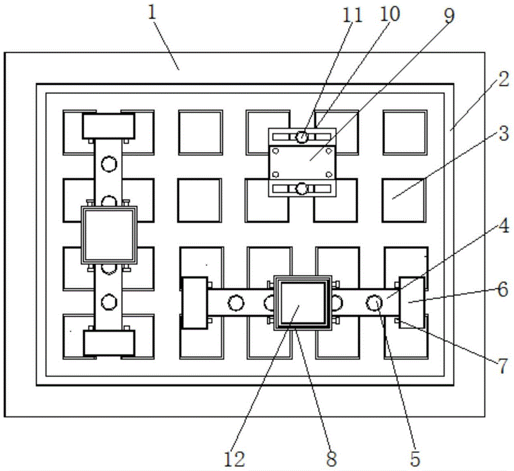 The utility model discloses in: the flexible adjusting plate 9 forms a clamping structure with the limiting module 3 through a fixed groove frame 10 and a limiting bolt 11, and the fixed groove frame 10 is symmetrically distributed about a transverse and straight center line of the flexible adjusting plate 9; various clamping parts can be arranged on the top surface of the flexible adjusting plate 9, and the simple structure of the flexible adjusting plate 9 can be effectively adjusted and limited through the limiting module 3, so that the flexible adjusting plate is very flexible.