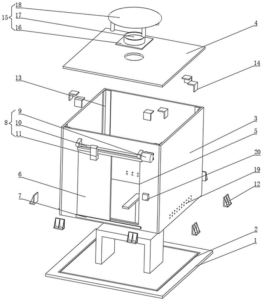 In the figure: the air conditioner comprises a base plate 1, slots 2, wall plates 3, a top plate 4, an inlet and an outlet 5, a door body 6, a sliding chute 7, a moving mechanism 8, a motor 9, a screw rod 10, a connecting block 11, a first connecting piece 12, a second connecting piece 13, a third connecting piece 14, an exhaust mechanism 15, an exhaust flange pipe 16, a fan 17, a ceiling 18, air holes 19 and switches 20.