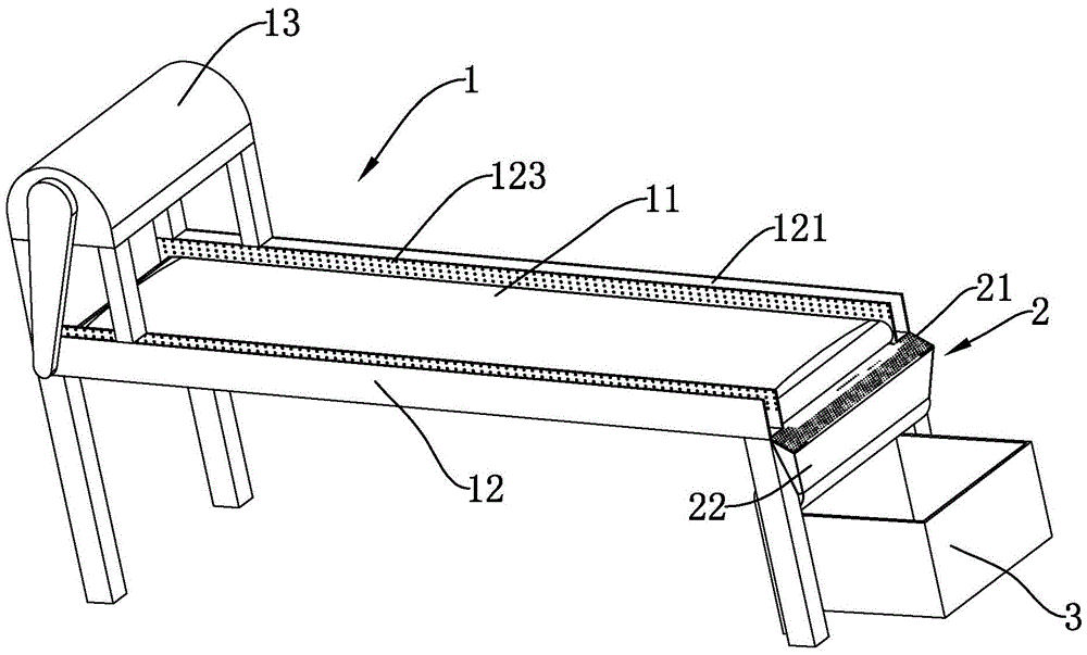 Referring to fig. 1 and 7, the equipment further comprises a drainage device 2, the drainage device 2 is arranged at the tail of the conveying device 1, the drainage device 2 comprises a screen plate 21 and a drainage pipeline 22, the screen plate 21 is obliquely arranged along the horizontal direction, two sides of the higher end of the screen plate 21 are fixedly connected to two sides of the rack 12, and the middle of the higher end of the screen plate 21 is abutted to the conveying belt 11. The screen plate 21 is provided with a plurality of meshes 1231, the screen plate 21 is fixedly connected with the drainage pipeline 22, and the saline water left along the conveyor belt 11 and the groove 121 flows into the drainage pipeline 22 from the meshes 1231 on the screen plate 21. The drain duct 22 has a double-layered plate structure, and the middle portion of the double-layered plate structure is used to pass the salt water. The drain duct 22 extends from the end near the conveyor belt 11 toward the middle of the frame 12, and is recessed toward the inside of the conveyor 1 along the rotary shaft 16 and extends in the direction away from the conveyor belt 11, which saves space and provides sufficient space for installing a post-processing device at the rear of the conveyor 1. The arrangement of the drain device 2 can realize the centralized collection of the brine separated from the kimchi.