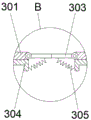 As shown in fig. 3, the opening at the bottom end inside the compression box 301 of this embodiment is rotatably connected with the opening plate 303 through a bearing, and a spring 305 is fixedly connected between the bottom end of the opening plate 303 and one side of the collection box 304, when a sufficient amount of chips are extruded by the electric push rod 302, the chips exceeding a certain mass press the opening plate 303 to extrude the spring 305, the opening plate 303 rotates, the chips fall into the collection box 304, and the opening plate 303 resets to complete automatic collection of the chips.