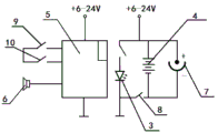Referring to the drawings, the utility model provides a portable LED ultraviolet automatic sterilizer, which comprises a shell 1, an ultraviolet device and an electronic control device, wherein the shell 1 is a quadrilateral box structure made of plastics, the ultraviolet device comprises a corn sample lamp holder 2, a UVC LED lamp module 3 and a DC6-24V lithium battery 4, the corn sample lamp holder 2 is a corn sample bracket made of metal and is arranged at the top of the shell 1, the UVC LED lamp module 3 is formed by welding UVC LED lamp beads on an aluminum substrate or a copper substrate and is connected with the DC6-24V lithium battery 4 through a flexible wire, the DC6-24V lithium battery 4 is arranged in a box body of the shell 1, the electronic control device is formed by a delay time relay module 5, a buzzer 6, a power socket 7, a master switch 8, a sterilization switch 9 and a human body induction switch 10, the time delay relay module 5 is installed in a box body of the shell 1 and is respectively connected with a DC6-24V lithium battery 4, a buzzer 6, a power socket 7, a main switch 8, a disinfection switch 9 and a human body induction switch 10, the buzzer 6 is installed in the box body of the shell 1, the power socket 7, the main switch 8 and the disinfection switch 9 are respectively installed on a panel on the side face of the box body of the shell 1, the human body induction switch 10 is installed at the top of the corn-like lamp bracket 2, and the time delay relay module 5 is further connected with the UVC LED lamp module 3. The UVC LED lamp module 3 comprises 36-44 UVC LED lamp beads with power of 0.4-1.0W and wavelength of 260-275 nm. The UVC LED lamp module 3 evenly arrange through the heat-conducting glue and glue around and on the top of maize appearance lighting fixture 2. The size length of the shell 1 is 135-145mm, the width is 76-80mm, and the height is 28-32mm, and the size length of the corn-like lamp holder 2 is 45-55mm and the height is 80-90 mm. The sound of the buzzer 6 is emitted once per second. The delay time relay module 5 has the functions of controlling the A time and the B time, wherein the A time is delay opening time and is adjustable from 1 to 999 seconds, the B time is opening time and is adjustable from 1 to 999 seconds, and the A time is automatically closed after the B time.