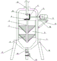 图中标号说明:1、过滤塔;2、驱动电机;3、连接杆;4、第一齿轮;5、转动杆;6、第二齿轮;7、第一过滤漏斗;8、第二过滤漏斗;9、转动环;10、支撑板;11、第一支撑杆;12、进水管;13、分水器;14、出水管;15、阀门;16、套接环;17、第二支撑杆;18、第一除杂门;19、第二除杂门。