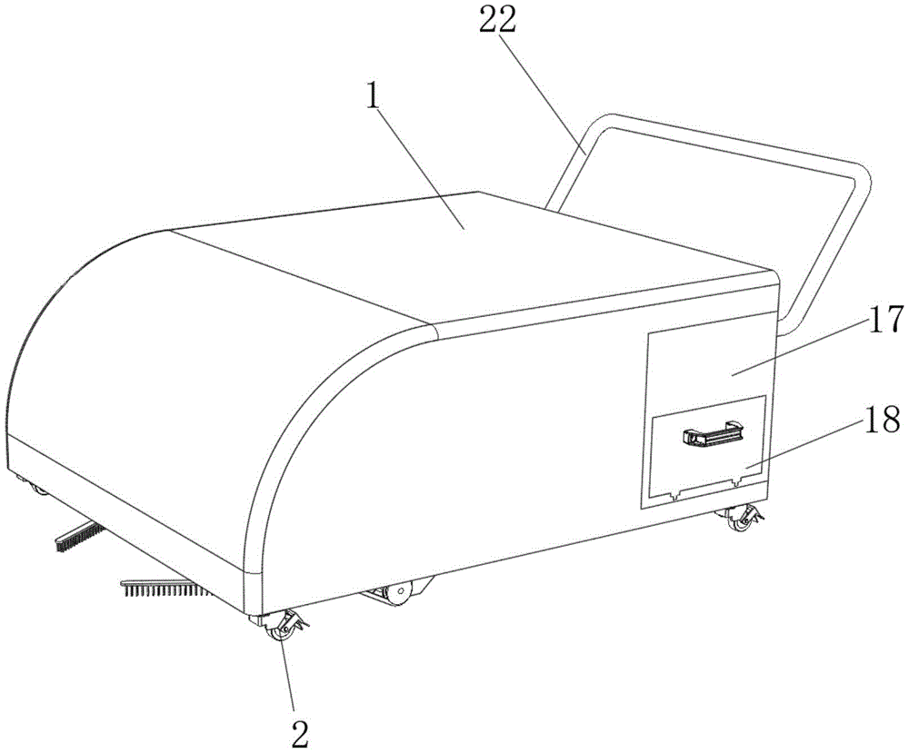 In the figure: 1. a box body; 101. an avoidance groove; 102. a dust collection through groove; 2. a universal brake wheel; 3. a double-shaft motor; 4. rotating the rod; 5. a first rotating shaft; 6. a drive bevel gear; 7. a driven bevel gear; 8. a brush; 9. a support plate; 10. a second rotating shaft; 11. a cleaning roller; 12. a driven wheel; 13. a driving wheel; 14. a transmission belt; 15. a dust hood; 16. a communicating pipe; 17. a recycling bin; 18. a recovery box; 19. a filter screen; 20. a handle; 21. an exhaust fan; 22. a push rod.