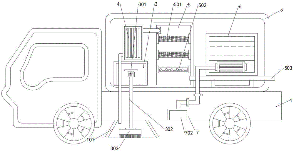 The labels in the figure are: 1. cleaning a vehicle bottom plate; 101. a dust collecting cover; 2. cleaning the car box body; 3. mounting a cover; 301. a drive motor; 302. rotating the rod; 303. cleaning with a brush; 4. a vacuum cleaner; 5. a dust removal box; 501. a fine molecular filter screen; 502. an activated carbon adsorption plate; 503. an exhaust port; 6. a water storage tank; 7. a chute; 701. an electric push rod; 702. a main supporting plate; 703. and a secondary support plate.
