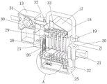 Referring to fig. 1-4, a high-efficiency multifunctional energy-saving dust collector comprises a housing 1, a cleaning door is arranged on one side of the housing 1, a dust removing box 17 is fixed on one side inner wall of the housing 1 through bolts, a dust collecting box 25 is fixed on one side inner wall of the housing 1 through bolts, dust removing openings are respectively arranged on the top of the dust collecting box 25 and the bottom of the dust removing box 17, two binding posts 30 are fixed on the bottom inner wall of the dust removing box 17 through bolts, a motor 28 is fixed on one side outer wall of the dust collecting box 25 through bolts, one end of an output shaft of the motor 28 passes through one side key of the dust collecting box 25 to be connected with a gear 26, a plurality of mounting plates are respectively fixed between the two side inner walls of the dust removing box 17 and between the two side inner walls of the dust collecting box 25 through bolts, a dust removing rod 33 is fixed on one side of the mounting plates through bolts, the dust removing rod 33 is electrified through the binding posts 30, and static electricity is generated on the surface of the dust removing rod 33, dust in the dust removing box 17 is adsorbed on the dust removing rod 33, one side of the dust removing rod 33 is connected with a lifting frame 29 in a sliding mode, one side of the lifting frame 29 is fixed with two racks 27 through bolts, the racks 27 are meshed with the gear 26, the gear 26 rotates under the driving of the motor 28, the lifting frame 29 slides up and down on the surface of the dust removing rod 33 under the meshing action of the gear 26 and the racks 27 to scrape off the dust adsorbed on the dust removing rod 33, a poking block 37 is fixed at the bottom end of each rack 27 through bolts, a dust blocking plate 35 is fixed between the inner walls of two sides of the dust collecting box 25 through bolts, a plurality of air vents are arranged at the top of each dust blocking plate 35, a fixing plate is fixed at the top of each dust blocking plate 35 through bolts, one side of the fixing plate is connected with a rotating frame 36 in a rotating mode, the poking block 37 is driven to move downwards while the racks 27 move downwards, and accordingly the rotating frame 36 is driven to rotate downwards, one side of the rotating frame 36 is rotatably connected with a linkage rod 38, one side of the linkage rod 38 is rotatably connected with a plurality of first rotating shafts, one end of each rotating shaft is fixedly provided with a cleaning plate 39 through a bolt, the cleaning plate 39 is positioned above the dust blocking plate 35, one end of the cleaning plate 39 is fixedly provided with a second rotating shaft through a bolt, the other end of the second rotating shaft is rotatably connected with the inner wall of one side of the dust collecting box 25, the bottom of the dust blocking plate 35 is fixedly provided with a mounting block through a bolt, one side of the mounting block is fixedly provided with a spring 34 through a bolt, the linkage rod 38 and the cleaning plate 39 further rotate together, the cleaning plate 39 is reset under the elastic action of the spring 34, accordingly, dust falling onto the dust blocking plate 35 is cleaned, and the other end of the spring 34 is fixedly connected with one side of the rotating frame 36.