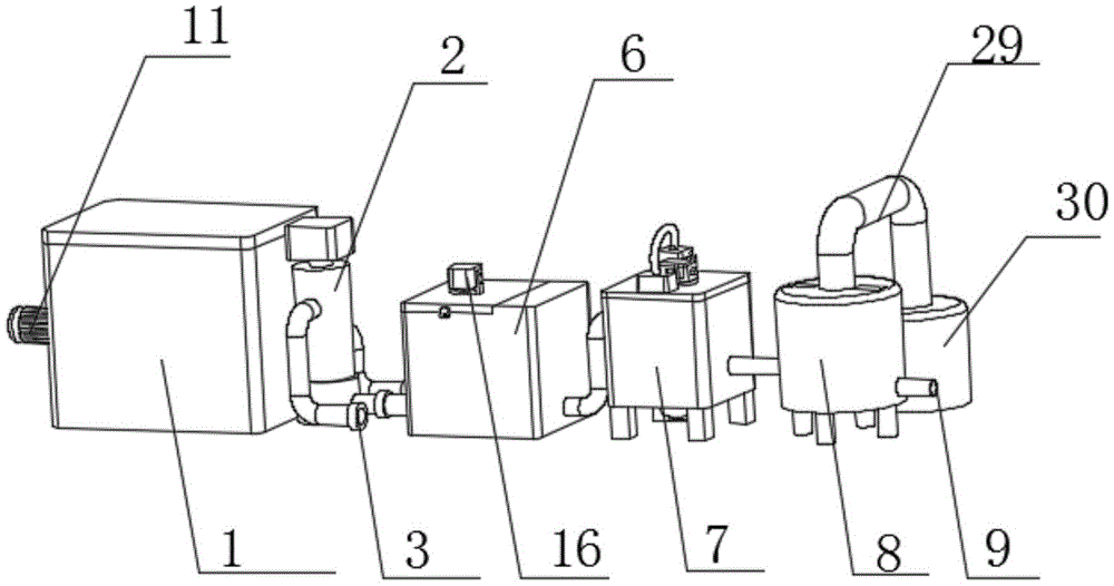 as shown in fig. 1 and 2, a backwashing device 2 is arranged at the side end of a filtering chamber 1, a backwashing outlet 3 is arranged at the side end of the backwashing device 2, a water inlet 4 is arranged at the side end of the backwashing outlet 3, a water outlet 5 is arranged at the side end of the water inlet 4, a crushing chamber 6 is arranged at the side end of the water outlet 5, a centrifugal separation chamber 7 is arranged at the side end of the crushing chamber 6, a treatment purifying chamber 8 is arranged at the side end of the centrifugal separation chamber 7, a water outlet 9 is arranged at the side end of the treatment purifying chamber 8, cover plates 10 are respectively arranged at the upper ends of the filtering chamber 1, the crushing chamber 6 and the centrifugal separation chamber 7, the backwashing device 2 is movably connected with the filtering chamber 1, the backwashing outlet 3, the water inlet 4 and the water outlet 5 are fixedly connected with the backwashing device 2, the crushing chamber 6 is movably connected with the water outlet 5, the crushing chamber 6 is movably connected with the centrifugal separation chamber 7, and the water outlet 9 is fixedly connected with the treatment purifying chamber 8, through the arrangement of the back washing device 2, dirt and impurities in the filtering chamber 1 can be cleaned, the water purification efficiency is improved, the first motor 11 is arranged at the side end of the filtering chamber 1, the cleaning barrel 12 is arranged at the side end of the first motor 11, the first motor 11 is movably connected with the cleaning barrel 12, the filtering material 13 is arranged in the cleaning barrel 12, the filtering material 13 is movably connected with the cleaning barrel 12, the rear end of the filtering chamber 1 is provided with a hinge 14, the hinge 14 is movably connected between the cover plate 10 and the filtering chamber 1, the front end of the crushing chamber 6 is provided with a buckle 15, the crushing chamber 6 is movably connected with the cover plate 10 through the buckle 15, through the cooperation of a motor 11 and wash bowl 12, through inside filter material 13, disinfect, go out algae when improving the suspended solid and get rid of the effect, scale control, anticorrosive, simple structure, simple to operate, area is little, reduction equipment cost.
