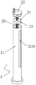 请参阅图3,本实用新型实施例中,升降件2包括有立筒21,立筒21是贯穿滑动安装于滑动槽310的内部,且限位板31的上端嵌入转动安装有把手一22,把手一22的下端固定连接有螺杆23,螺杆23的下端转动连接于立筒21的下端内部表面,且螺杆23的外表面套接设置有圆形块24,圆形块24的前后侧均固定连接有凸轴25,两个凸轴25相背的一端分别与限位板31上的滑动槽310内部前后表面固定连接,圆形块24的上表面中间位置处开设有与螺杆23相适配的螺纹孔,螺杆23是一种不锈钢材质构件,不锈钢起到防锈作用,立筒21的前后表面均开设有与凸轴25相适配的滑槽2101,两个凸轴25相背的一端分别滑动穿过两个滑槽2101的内部,凸轴25移动时会在滑槽2101中滑动。
