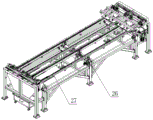 As shown in fig. 10, the width adjusting device includes a driving shaft 28 mounted on the frame 24, the driving shaft 28 is connected to a motor, a driven shaft is mounted on the opposite side of the driving shaft 28, a synchronizing shaft 11 is connected between the driving shaft 28 and the driven shaft, a slider 27 is connected to the synchronizing shaft 11, a stirrup conveying roller way is connected to the slider 27, and the slider 27 can move transversely along the frame 24. The motor rotates to drive the driving shaft 28 to drive the synchronous belt 29 to rotate, so that the sliding blocks 27 slide along with the synchronous belt, and the spacing adjustment of the stirrup conveying roller way is realized.