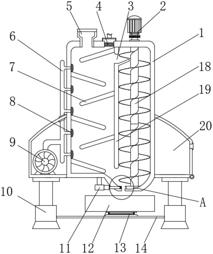 Referring to fig. 1-3, a post-treatment process dehumidification device for a polyacrylamide device comprises a device body 1, a driving motor 2 is installed at the upper end of the device body 1, a transmission shaft of the driving motor 2 penetrates through one side of the device body 1 to be vertically provided with a spiral conveying rod 18, a partition plate 19 is installed at one side of the spiral conveying rod 18, a backflow port 3 is formed in the upper end of the partition plate 19, a shell 20 is arranged at one side of the device body 1, an air heater 9 is installed inside the shell 20, the air heater 9 is connected with an air outlet 8 through an air duct 6, a plurality of air outlets 8 are installed, and a dust screen is installed on the surface of the air outlet 8.