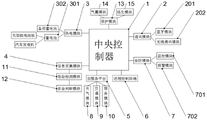 工作时,监控模块701包括光栅传感器、高清摄像头、红外传感器和烟雾传感器,报警模块702包括扬声器、指示灯和远程报警单元,通过设置有监控模块701和报警模块702,监控模块701可以对房车内部或者外部进行监控,光栅传感器可以对房车进行外部进行预警,防止有人闯入,可以及时发出报警,烟雾传感器可以对房车内部进行检测,防止发生火灾,报警模块702可以通过扬声器、指示灯和远程报警单元等及时报警;信息采集模块4电性连接有指纹识别模块、面部识别模块、磁卡识别模块、光栅传感器、高清摄像头、红外传感器和烟雾报警器,通过设置有指纹识别模块、面部识别模块、磁卡识别模块,可以通过这些进入房车内部,省去了钥匙的繁琐,更加智能和便捷,且当识别错误时还可以对远程终端进行报警提示;云服务平台5包括天气模块8、交通模块9和服务模块10,天气模块8、交通模块9和服务模块10与中央控制器1电性连接,通过设置有云服务平台5,可以提前了解以及及时通知天气和交通情况,防止发生意外,可以更好的保证安全出行;信息采集模块4包括危险检测模块11,危险检测模块11电性连接有安全判断模块12,安全判断模块12电性连接有高清摄像头,摄像头为360度旋转摄像头,通过设置有安全判断模块12和危险检测模块11,安全判断模块12用于根据房车内人员体征参数判断房车内人员是否处于非安全状态,危险检测模块11用于在房车内人员处于非安全状态时,检测房车预设范围内是否有异常状况,以及通过摄像头监控检测和预判房车外部可能会遇到的情况,还可以对房车内部进行监控,保证房车的安全性;通过设置有气囊模块14,当发生意外时,可以打开外部气囊和内部气囊,增加缓冲性能,保护房车和房车内部的人员,防止受到伤害;通过设置有逃生模块,防止房车发生意外,内部人员不能及时逃出,且设置有备用蓄电池302,增加了安全性,防止房车损坏,不能继续提供电力支持。