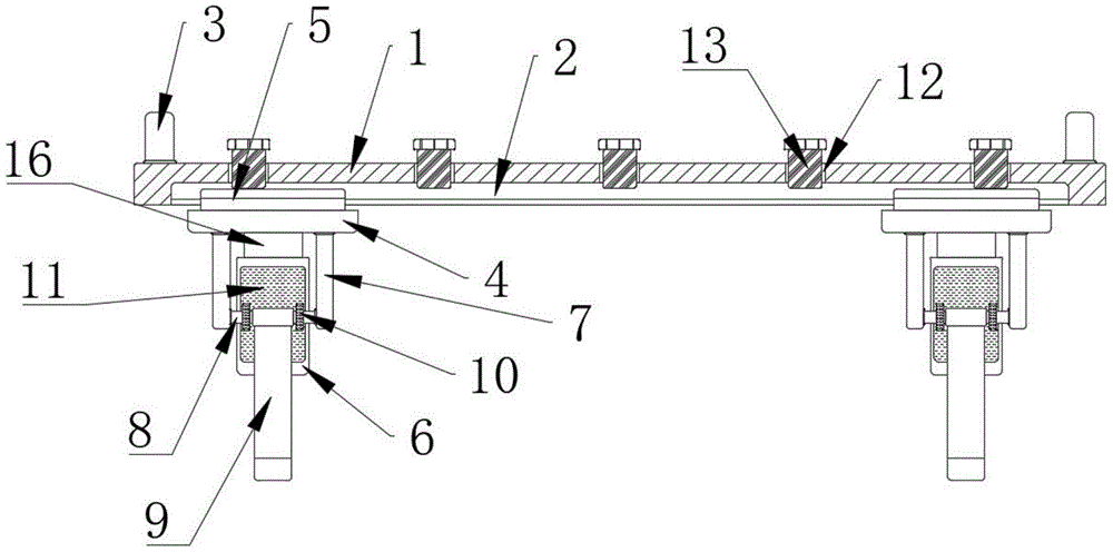 1. a hanger plate; 2. a chute; 3. lifting lugs; 4. mounting a plate; 5. a slider; 6. a support plate; 7. a vertical rod; 8. a horizontal axis; 9. clamping arms; 10. a transmission gear; 11. a toothed belt; 12. a thread groove; 13. a bolt; 14. a limiting rod; 15. a non-slip mat; 16. clamping a plate; 17. a tension spring.