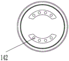 The water flow enters the oblique water hole of the oblique water body through the upper shell 113 to impact the rotor, the rotor is further provided with an eccentric wheel 121, when the rotor rotates, the eccentric wheel 121 rotates along with the rotor and drives the water distribution disc to deflect, the outer periphery of the water distribution disc is provided with outer teeth 132 which are matched with inner teeth 143 arranged on the lower shell to realize speed reduction rotation (namely, a differential gear speed reduction mechanism), and when the water distribution disc rotates, different water outlet areas on the lower shell can be intermittently connected, so that intermittent water outlet of different areas is realized. Different from the first embodiment in which the water outlet is disposed on the lower housing, the second embodiment in which a face cover 114 is disposed below the lower housing is provided with a water outlet 142, and the face cover is divided into two areas, which are respectively connected to two water outlet areas corresponding to the lower housing. The water outlet holes are arranged on the face cover, so that the individual arrangement of the water outlet effect can be realized, the face cover with the water outlet holes in different arrangement modes or different densities can be selected to be matched with the lower shell, and the assembly and disassembly are convenient.
