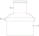 第一限位部4靠近入口的一侧设置有第一密封部8,第一密封部8与第一限位部4连通,第一密封部8的内径沿液体的流通方向逐渐增大,第一密封部8的最小直径小于第一限位部4的最小直径,硅胶阀还包括第一密封阀体9,阀体3靠近入口的一侧与第一密封阀体9连接,第一密封阀体9的直径等于第一密封部8的最小直径,切口31位于第一密封阀体9,通道延伸至第一密封阀体9,第一密封阀体9远离出口的部分和第一密封部8呈过盈配合,第一密封阀体9靠近切口31的一侧与第一密封部8靠近切口31的一侧齐平。