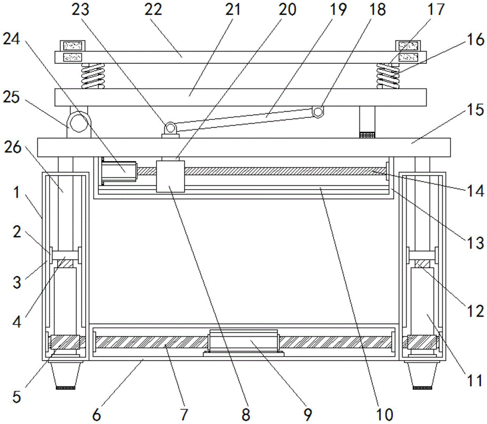 Referring to fig. 1-2, a novel ironing machine with adjustable ironing angle comprises two supporting bins 1, an adjusting bin 6 fixedly connected between the two supporting bins 1, slide rails 3 fixedly connected to the inner walls of the left and right sides of the supporting bins 1, lifting plates 4 movably mounted inside the supporting bins 1, sliders 2 slidably connected to the slide rails 3 and fixedly connected to the left and right sides of the lifting plates 4, rotating rods 11 movably mounted on the inner bottom walls of the two supporting bins 1, bottom threaded rods 12 respectively connected to the bottoms of the two lifting plates 4, wherein one end of each threaded rod is respectively penetrated through and extended into the two rotating rods 11, thread grooves are respectively formed in the tops of the two rotating rods 11, the two thread grooves are respectively connected to the two threaded rods, and lifting rods 26 respectively connected to the front and back surfaces of the tops of the two lifting plates 4, wherein one end of each lifting rod is penetrated through and extended to the top of the supporting bins 1, the front and the back of the top of the two supporting bins 1 are both provided with circular through holes, the four circular through holes are respectively matched with the four lifting rods 26, the top of the four lifting rods 26 is fixedly connected with a horizontal plate 15, the peripheral walls of the two rotating rods 11 are both fixedly provided with worm wheels 5, the inner bottom wall of each adjusting bin 6 is fixedly provided with a double-shaft motor 9, output shafts at the left and the right sides of the double-shaft motor 9 are both fixedly connected with worms 7, one ends of the worms 7 respectively penetrate through and extend to the inside of the two adjusting bins 6 and are meshed with the worm wheels 5, the two worms 7 are respectively movably connected with the inner walls at the opposite sides of the two adjusting bins 6, the bottom of the horizontal plate 15 is fixedly connected with a metal bin 13, the metal bin 13 is in a rectangular shape with a hollowed inside and a missing top, the inner wall at the left side of the metal bin 13 is fixedly provided with a driving motor 24, the output shaft of the driving motor 24 is fixedly connected with a top threaded rod 14 movably connected with the inner wall at the right side of the metal bin 13, a limiting rod 10 positioned at the bottom of a top threaded rod 14 is fixedly connected between the inner walls of the left side and the right side of an adjusting bin 6, a movable block 8 positioned at the outer side of the limiting rod 10 is movably arranged at the outer side of the top threaded rod 14, a threaded through hole in threaded connection with the top threaded rod 14 is formed in the right side of the movable block 8, a limiting hole matched with the limiting rod 10 is formed in the right side of the movable block 8, a U-shaped connecting frame 25 is fixedly connected to the left side of the top of a horizontal plate 15, a turnover plate 21 is hinged to the top of the U-shaped connecting frame 25, two top U-shaped hinge frames 18 are fixedly connected to the bottom of the turnover plate 21, telescopic rods 16 are fixedly connected to the periphery of the top of the turnover plate 21, each telescopic rod 16 consists of a sleeve bin and a moving rod, one end of the moving rod penetrates through and extends into the sleeve bin, limiting blocks positioned in the sleeve bin are fixedly connected to the outer side of the moving rod, a through hole matched with the moving rod is formed in one side of the sleeve bin, the limiting blocks are arranged to prevent the moving rod from being separated from the sleeve bin in the moving process, the top parts of the four telescopic rods 16 are fixedly connected with the ironing plate 22, the left side and the right side of the inside of the ironing plate 22 are respectively embedded with a first magnet plate, the left side and the right side of the top part of the ironing plate 22 are respectively movably provided with a pressing plate, the inside parts of the two pressing plates are respectively embedded with a second magnet plate, the first magnet plate can be adsorbed with the second magnet plate, the pressing plates can press and hold clothes placed on the ironing plate 22 through the adsorption of the first magnet plate and the second magnet plate, the outer side of each telescopic rod 16 is sleeved with a reset spring 17, the front surface and the back surface of the top part of the moving block 8 are respectively fixedly connected with moving rods 20, one end of each moving rod 20 penetrates through and extends to the top part of the horizontal plate 15, the top part of the horizontal plate 15 is provided with two rectangular through holes, the two moving rods 20 respectively penetrate through the two rectangular through holes, the rectangular through holes are matched with the moving rods 20, the moving rods 20 can move left and right in the rectangular through holes, the top of two movable rods 20 is all fixedly connected with bottom U type articulated frame 23, and the top of two bottom U type articulated frames 23 all articulates there is the connecting rod 19 with two articulated frame 18 articulated of top U type respectively, and the electrical components that appear in here all is connected with master controller and power electricity, and the master controller can play the conventional known equipment of control for the computer etc. and the electric power connection technology of prior publication, and does not describe in this text in detail.