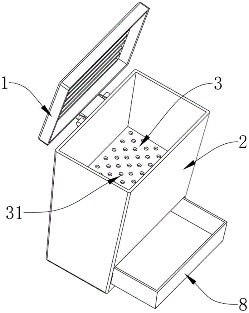 In this embodiment, a water storage container 8 is disposed in the lower chamber 22, the barrel body 2 is provided with a drawing opening 9, the water storage container 8 is slidably connected to the drawing opening 9, the water storage container 8 can be pushed in or pulled out from the drawing opening 9, and the upper end of the water storage container 8 is open and corresponds to the hollow hole 31 on the interlayer component to receive the liquid waste flowing down from above.