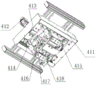 如图5和图6所示,推块装置41包括第二驱动装置和推块418,第二驱动装置包括第一电机412和固定顶板411,固定顶板411通过螺栓固定连接在顶端架的底面,固定顶板411和水平面相平行。第一电机412安装在固定顶板411的顶部,其输出端贯穿固定顶板411至固定顶板411的底面。
