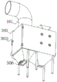 其中如图1、2、4所示,收集箱3的左侧铰接有箱门303,箱门303左壁的后侧固定有把手锁3031,在更换或对除尘布袋2进行维护时,通过操作把手锁3031即可打开箱门303,同时,把手锁3031的设置可使得箱门303与收集箱3处于可转动或不可转动的状态,除尘布袋2的内部设置的支撑架304可防止除尘布袋2在使用时变形,且支撑架304固定在收集箱3内部的上表面,除尘布袋2的上方对应收集箱3的上壁开设的通气孔302便于风扇1工作时将外部的灰尘吸入收集箱3的内部,通气孔302位于风扇1的正下方。