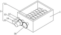 具体的,所述破碎单元5由破碎刀片51、转轴I52、主齿轮I53、固定架I54、电机I55和副齿轮I56组成,所述转轴I52的数量为两个,两个转轴I52分别通过轴承水平平行转动连接在破碎框体1内壁的左右两侧之间,两个转轴I52的外侧交错排列设有破碎刀片51,两个转轴I52延伸至破碎框体1外侧的一端分别设有主齿轮I53和副齿轮I56,所述电机I55通过固定架I54固定在破碎框体1的外侧,所述电机I55的输出轴与主齿轮I53的外侧固定连接,所述电机I55与控制开关组10电性连接,通过电机I55带动主齿轮I53的转动,进而带动副齿轮I56的转动,从而带动两个转轴I52以及其上操作排列的破碎刀片51的相向转动,对化学实验用的原料进行破碎。