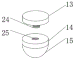 It should be noted that the utility model is a high-strength damping elevator counterweight housing, when in use, the arc-shaped buffer rubber head 15, the telescopic rod 12, the connecting rod 11, the buffer cavity 21, the sliding block 22 and the sealing ring 23 are mutually matched to perform primary buffer damping on the counterweight housing 1, the limit telescopic column 7, the buffer base 8, the slot 16, the compression groove 19, the compression plate 17, the second buffer spring 18 and the sliding rod 20 are mutually matched to perform secondary buffer damping on the counterweight housing 1, the first buffer spring 9 and the connecting plate 10 are mutually matched to perform tertiary buffer damping on the counterweight housing 1, specifically, when the bottom of the counterweight housing 1 is impacted, the arc-shaped buffer rubber head 15 drives the telescopic rod 12 to move upwards, the telescopic rod 12 drives the sliding block 22 to press the gas in the buffer cavity 21, the air pressure of the cavity generates reverse acting force, and the primary buffer damping effect is achieved under the action of the reverse acting force, buffer base 8 can drive connecting plate 10 extrusion first buffer spring 9 in slider 22 extrusion cushion chamber 21, buffer base 8 still can drive spacing flexible post 7 extrusion compression board 17 simultaneously, compression board 17 extrudees second buffer spring 18, thereby first buffer spring 9 and second buffer spring 18 can produce reverse effort, just reached second grade and tertiary buffering shock attenuation effect under the effect of reverse effort, multistage damper is mutually supported, the shock attenuation is effectual, the security is high, the impact force of high strength can be effectively cached, first installation piece 13, second installation piece 14, lead screw 24, the mutually supporting of mounting hole 25 can conveniently change arc buffering rubber head 15 after wearing and tearing.
