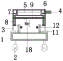 图中:1、矩形框,2、车轮,3、支撑架,4、第一减速电机,5、横轴,6、第四齿轮,7、第五齿轮,8、螺纹杆,9、横板,10、连接块,11、矩形块,12、第二减速电机,13、第一齿轮,14、第二齿轮,15、第三齿轮,16、夹爪,17、转杆,18、切割电机。