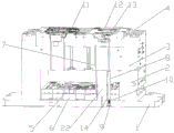 其中1、下固定板;2、方铁;3、下模板;4、下模仁;5、上顶板;6、下顶板;7、顶杆;8、防撞杆;9、压板;10、弹簧;11、产品;12、滑块;13、导向座;14、卡槽;15、穿孔;16、安全孔;17、斜孔;18、上模仁;19、上模板;20、上固定板;21、斜导柱;22、导向柱。