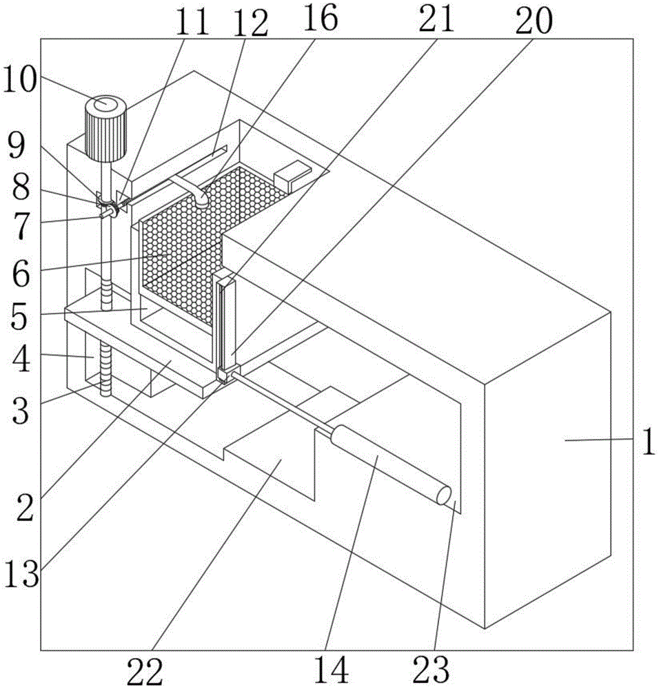 In the figure: 1. a cabinet body; 2. moving the plate; 3. a transmission screw rod; 4. a limiting groove; 5. a disinfectant tank; 6. a net cage; 7. a bidirectional screw rod; 8. a driven bevel gear; 9. a drive bevel gear; 10. a motor; 11. a moving groove; 12. connecting grooves; 13. a connecting seat; 14. a push rod; 15. a hot air blower; 16. a spray head; 17. an ultraviolet lamp; 18. a movable seat; 19. connecting blocks; 20. a sliding seat; 21. a sliding groove; 22. a first step; 23. a second step.