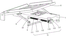 控制组件11包括与滑槽10一侧侧壁转动连接的转动杆111,转动杆111的外侧壁套接有移动套112,移动套112的两侧侧壁分别与滑槽10的两侧侧壁滑动连接,移动套112的底端固定有两个移动杆113,两个移动杆113的一端分别与两个滑块8的底端固定,底座1的一侧侧壁固定有安装盒114,转动杆111的一端延伸至安装盒114内部,安装盒114的顶端转动连接有转轴115,转轴115的底端与转动杆111的一端分别固定有互相啮合的锥齿轮116,安装盒114的顶端转动连接有与转轴115同轴设置的旋钮117;通过转动旋钮117即可调节支撑板5的支撑角度,使该装置能够更具使用需求进行任意调节,且操作便捷,提高了该装置的适用性。