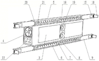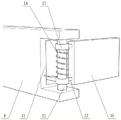 Further optimize the scheme, recess 11 has been seted up to the one end that backup pad 5 was kept away from to slide 9, is provided with bull stick 12 in the recess 11, bull stick 12 and slide 9 rigid coupling, the cover is equipped with two change 13 on the bull stick 12, change 13 through connecting rod 23 and lockplate 10 rigid coupling, change 13 and bull stick 12 rotate to be connected, the cover is equipped with torsional spring 14 on the bull stick 12, torsional spring 14 is located between two change 13, the one end and the slide 9 rigid coupling of torsional spring 14, the other end and the lockplate 10 rigid coupling of torsional spring 14. The rotating rod 12 and the rotating ring 13 are used for enabling the locking plate 10 to rotate relative to the supporting plate 5, when the heat dissipation cylinder 2 needs to be locked with the case 1, the rotating locking plate 10 and the case 1 are in a horizontal state, due to the existence of the torsion spring 14, an acting force for returning to the original position exists in the locking plate 10, at the moment, the locking plate 10 is abutted to the case 1, the two locking plates 10 clamp the case 1 under the action of the torsion spring 14, finally, the heat dissipation cylinder 2 is fixed on the case 1, when the heat dissipation cylinder needs to be detached, the locking plate 10 only needs to be rotated again, the locking plate 10 is separated from the case 1, then, the locking plate 10 is loosened, and the locking plate 10 returns to the original position under the action of the torsion spring 14.