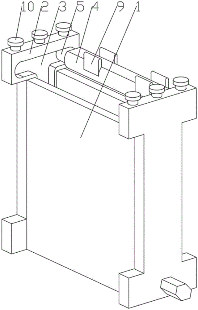 as shown in fig. 1-2, the utility model comprises a function frame 1, wherein both sides of the function frame 1 are respectively provided with an adjusting plate 2 matched with the function frame, the adjusting plate 2 is provided with an adjusting groove 3 near the side wall of one side of the function frame 1, the adjusting groove 3 is in an i shape, a function sleeve 4 is arranged between every two adjusting grooves 3, both ends of the function sleeve 4 are respectively inserted with a function ejector rod 5 matched with the adjusting groove 3, the adjusting plate 2 is in an i-shaped structure, a center shaft rotating rod 6 is arranged between the bottom of the adjusting plate 2 and the bottom of the function frame 1, the cross section of the center shaft rotating rod 6 is in an equilateral hexagon shape, the center shaft rotating rod 6 penetrates through the adjusting plate 2 and is inserted at the bottom of the function frame 1, a plurality of spring contraction rods 7 are arranged between the adjusting plate 2 and the function frame 1, and the spring contraction rods 7 are in threaded connection with the adjusting plate 2 through thread sleeves 8, from the design of counting up, the thread bush 8 is fixed in regulating plate 2, when using, can select to connect different positions and spring shrink pole 7 of quantity that varies through the thread bush 8, so, can control two regulating plate 2's shrinkage intensity, adjust the clamp force, and provide a structure that can dismantle, in addition, when the equilateral hexagon structure of axis bull stick 6 can let regulating plate 2 regard as bearing structure, have regular regulatory function and anti-skidding function.
