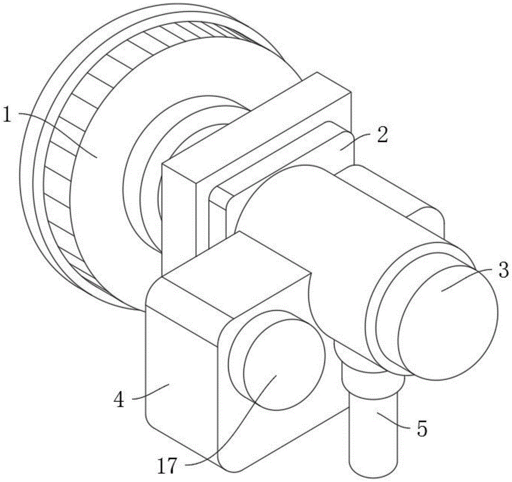 Further, actuating mechanism 3 includes protecting sheathing 13, and protecting sheathing 13's inside fixed mounting has grinding motor 14, and the transmission end of grinding motor 14 front end runs through installation mechanism 2 and extends to grinding mechanism 1's inside, through installing actuating mechanism 3 in the device rear, provides drive power to grinding mechanism, and grinding motor 14 runs through installation mechanism 2 and extends to grinding mechanism 1's inside, has ensured the reasonable of drive power and has gone on, has improved the work efficiency of device.