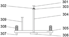 As shown in fig. 2 and 3, a reset groove 704 is formed at the bottom of the middle mold 7, the ejection mechanism 3 includes a mounting plate 305, a set of limiting rods 307 is slidably connected to the edge of the mounting plate 305, the limiting rods 307 are fixedly connected to the lower mold 6, a second spring 308 is sleeved on the outer surface of each set of limiting rods 307, the second spring 308 is fixedly connected to the mounting plate 305 and the lower mold 6, a first thimble 309 is fixedly mounted on the top of the mounting plate 305, the first thimble 309 vertically penetrates through the bottom of the lower mold 6 and extends to the top of the bump 601, a baffle 306 is disposed on the top of the mounting plate 305, a top rod 304 is fixedly connected to the top of the baffle 306, the top rod 304 vertically penetrates through the bottom of the mounting plate 305 and extends to the top of the middle mold 7, a limiting ring 303 is fixedly connected to the top of the top rod 304, a second thimble 301 is fixedly connected to the top of the limiting ring 303, and the second thimble 301 vertically penetrates through the bottom of the middle mold 7 and extends to the inside of the first mold cavity 703, the outer surface of the second thimble 301 is sleeved with a third spring 302, the third spring 302 is located inside the reset groove 704, and the third spring 302 is fixedly connected with the top of the reset groove 704.