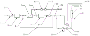 Preferably, the first-stage filter element 3 is further connected with an output end of the pressure release valve 22, the high-pressure switch 10 is further connected with an input end of a second flow meter 25, the normal-temperature water outlet electromagnetic valve 18 is further connected with an output end of the second flow meter 25, the second flow meter 25 is further connected with a flow control pump 23, and the flow control pump 23 is connected with a hot and warm water outlet electromagnetic valve 24.