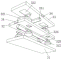 所述第二支撑板32的底部对应各所述第一升降装置312设置有第一滑槽325,各所述第一升降装置312的底部和所述第一支撑板31连接固定,各所述第一升降装置312的顶部可滑动地连接在所述第一滑槽325内。