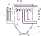过滤装置24包括环状空心套241,环状空心套241上部外围设有凸缘,环状空心套凸缘下部安装在柱状支撑架242上,柱状支撑架242外围套设过滤袋243,过滤袋243插入隔板23上的通孔内。采用此过滤装置,增大了过滤效果,并且方便检修更换。环状空心套241为密封橡胶。采用橡胶,保证了密封效果。